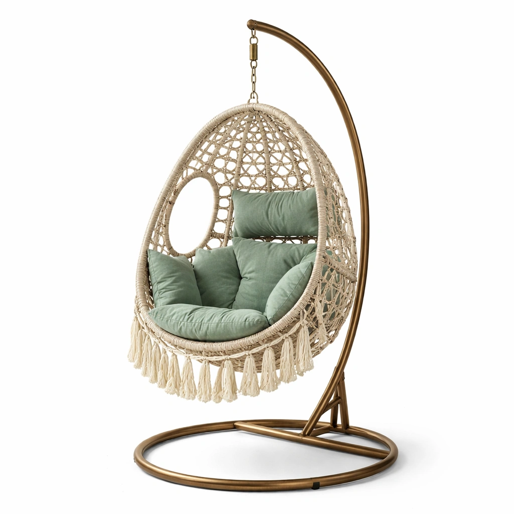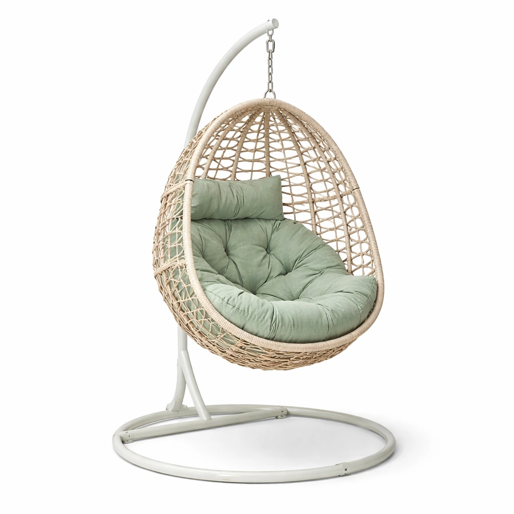 Silla colgante de ratán sintético beige con cojín verde y estructura metálica