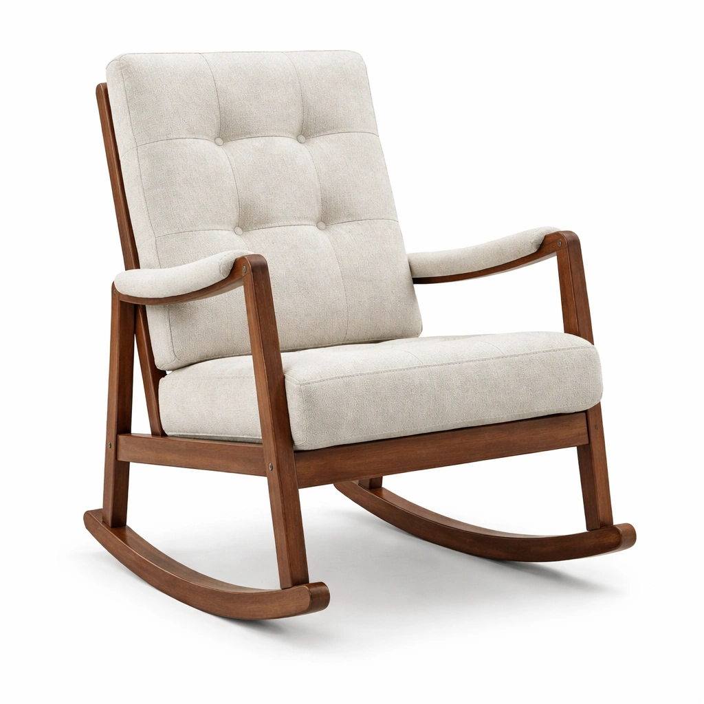 La silla mecedora tiene una estructura de madera maciza. El asiento y el respaldo están cubiertos con tejido de poliéster acolchado en color Beige.